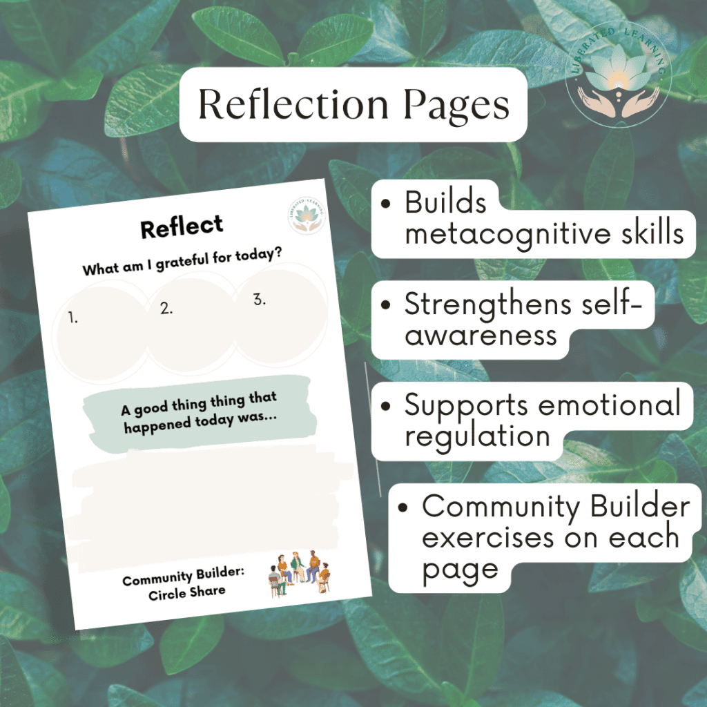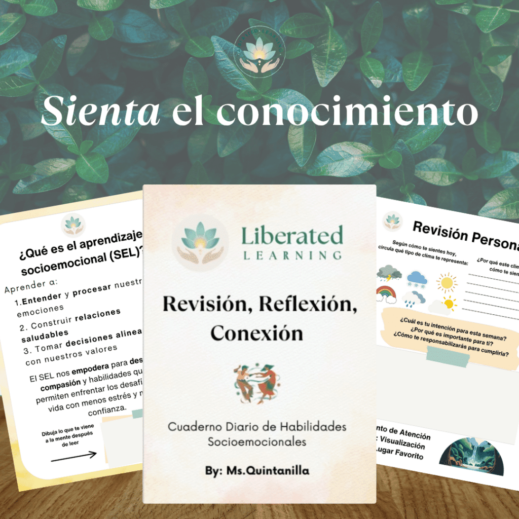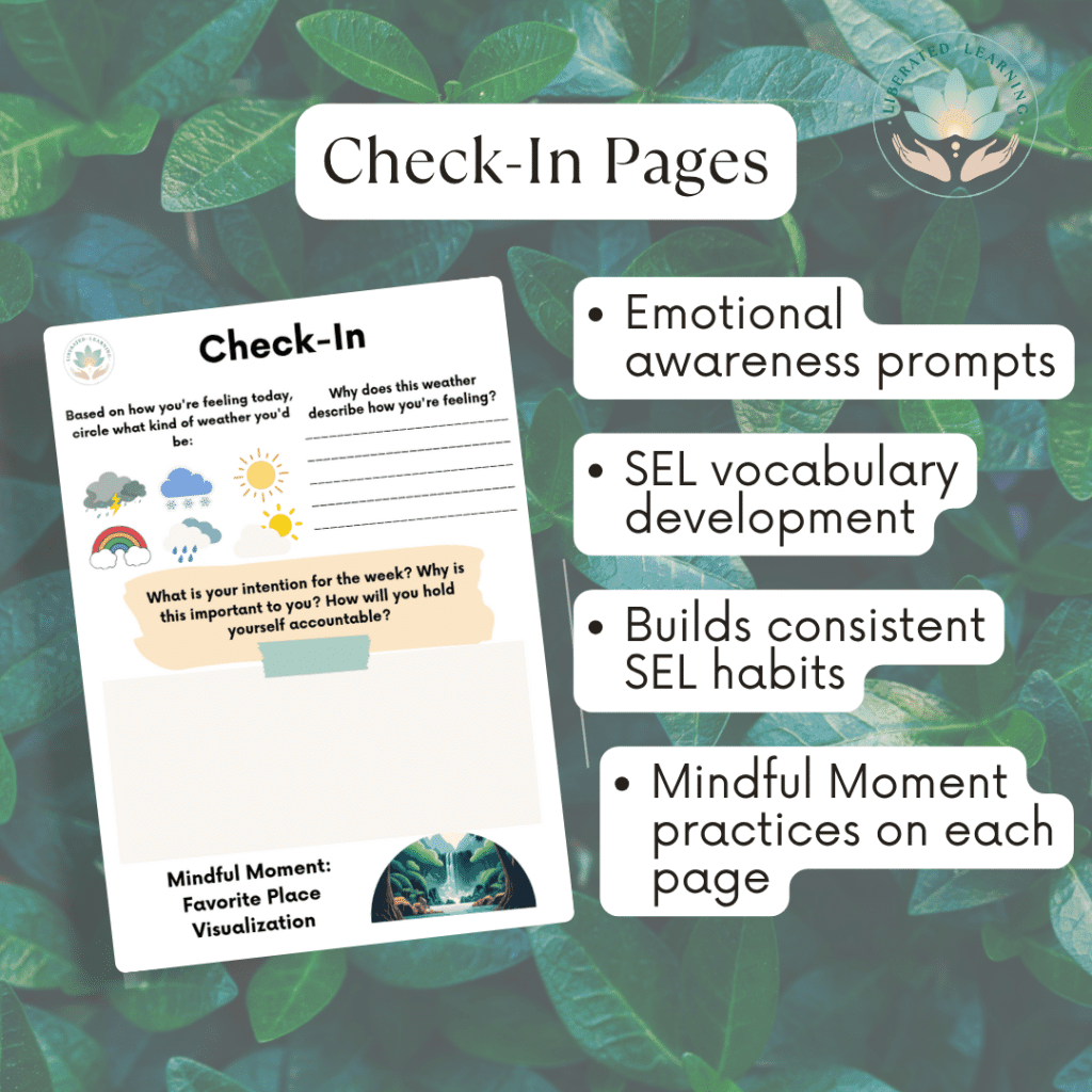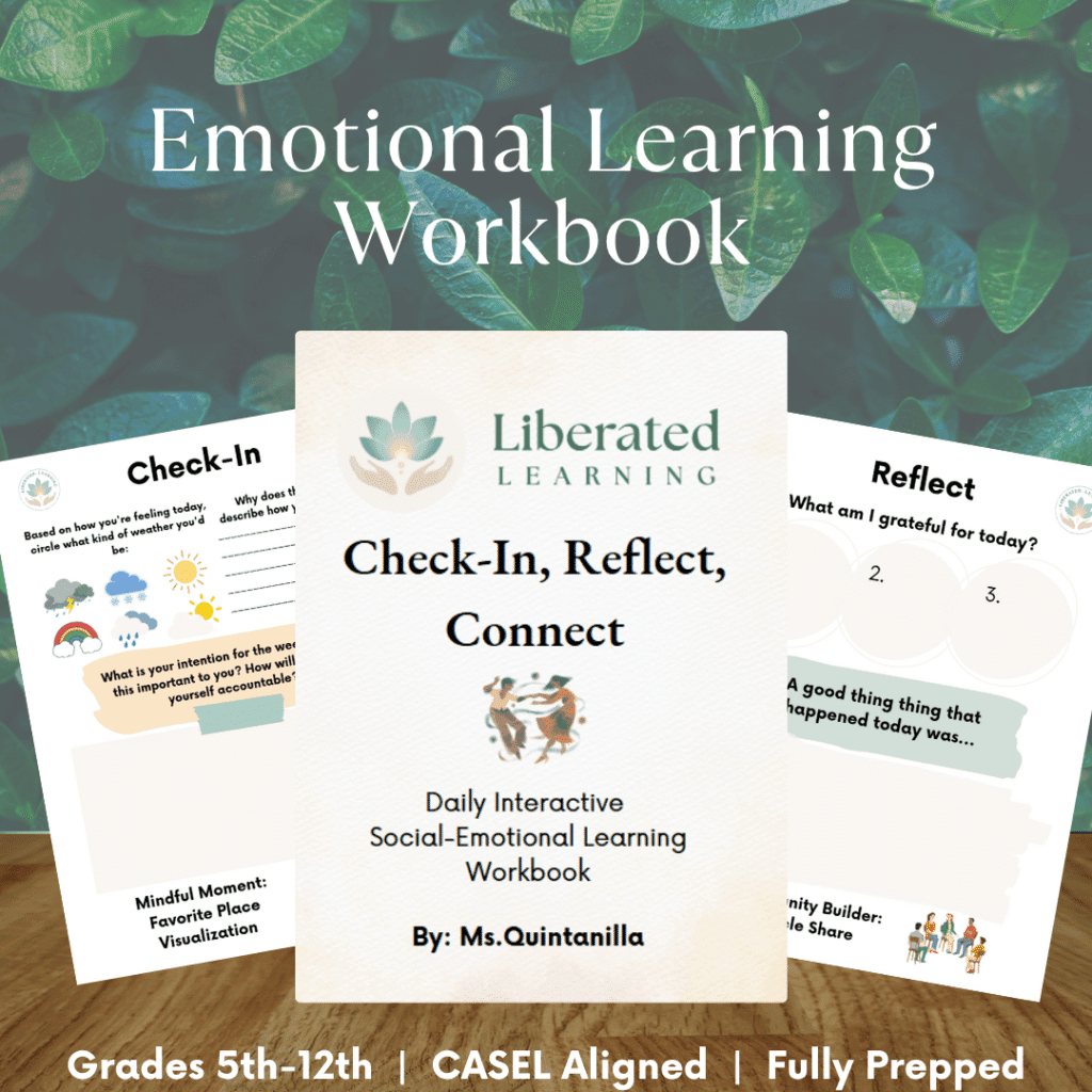 Student Workbook (Spanish available)80-page interactive journal guiding learners through the 5 CASEL competencies using mindfulness, gratitude, and restorative reflection.